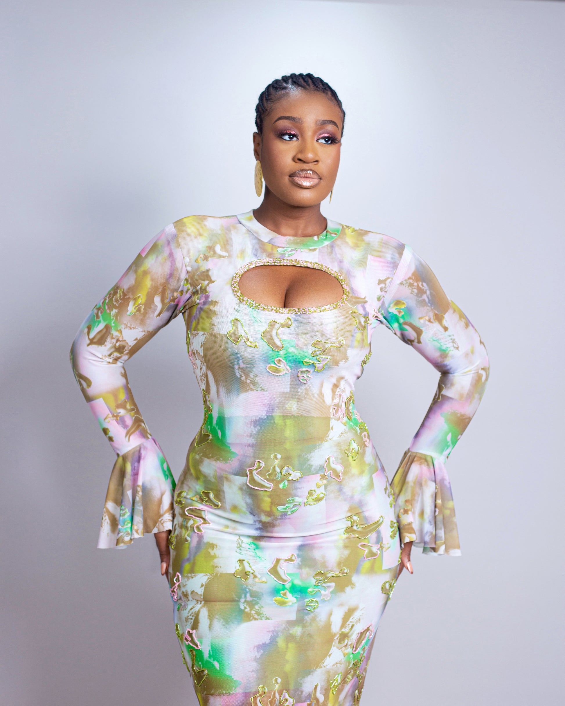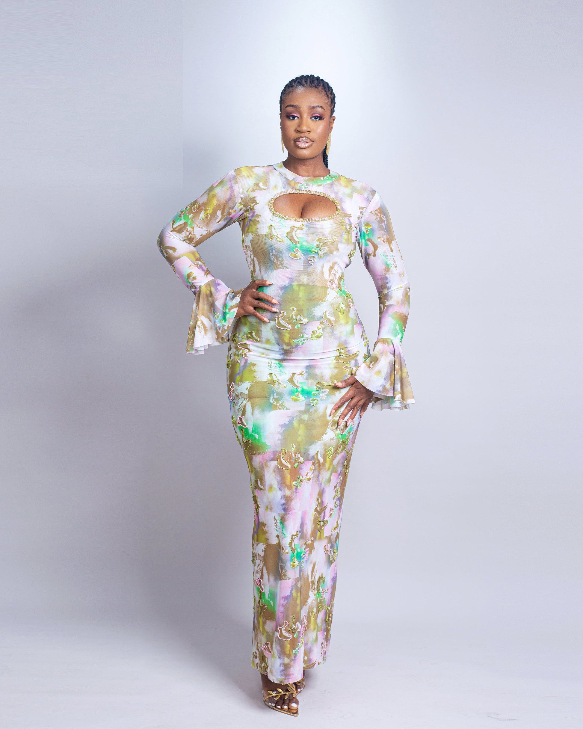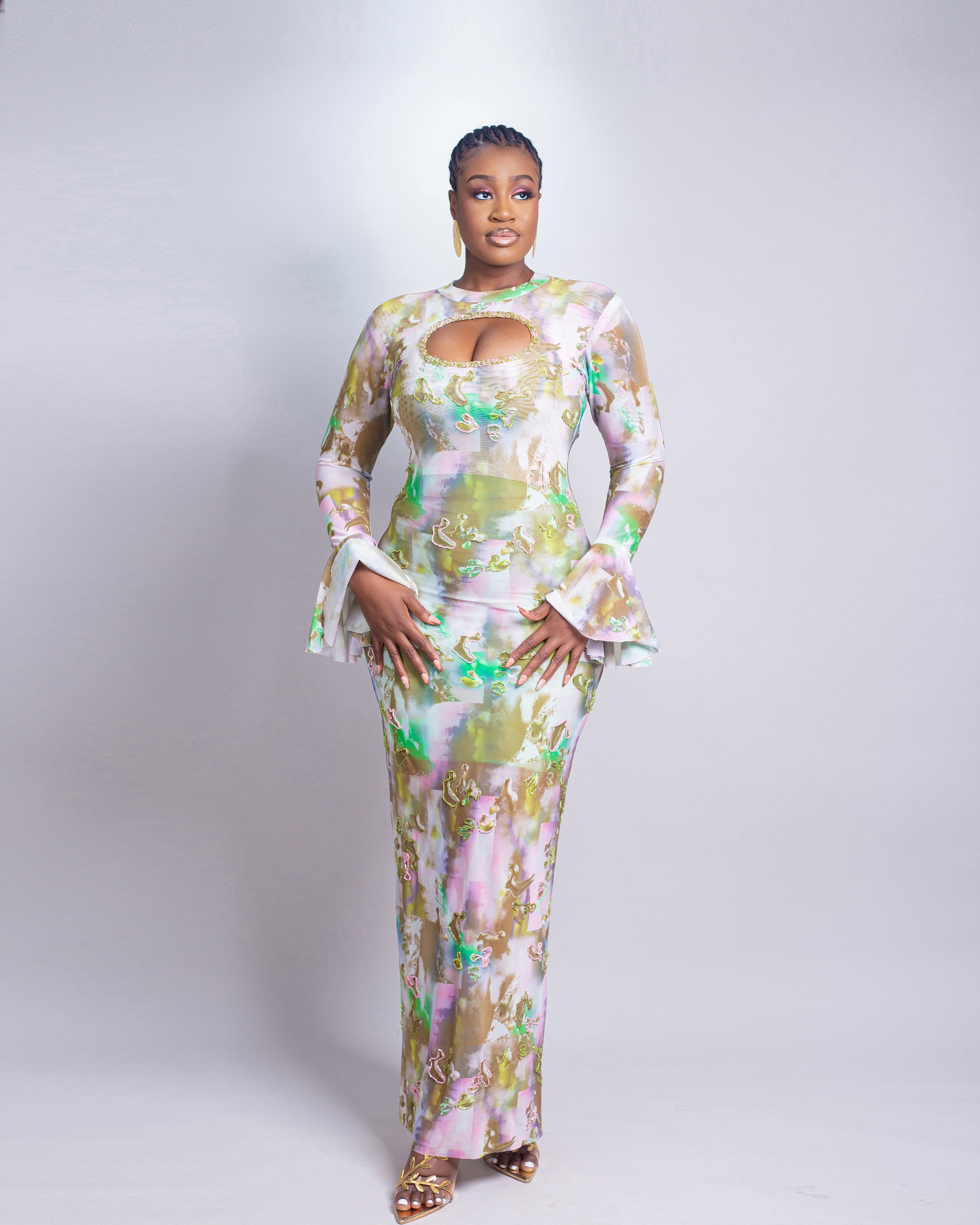 This captivating ensemble is crafted from a firm yet stretchy mesh fabric that sculpts the silhouette with effortless ease. The front panel dazzles with meticulous hand-beading, delicately adorned in pink and green accents that bring the design to life with subtle radiance. A keyhole neckline adds a hint of allure, while the flared cuffs and fluid floor-length skirt evoke timeless femininity. The soft, watercolor-inspired palette blends pastel tones with a modern edge, creating a look that is both elegant and ethereal—perfect for the woman who commands presence with poise and grace.