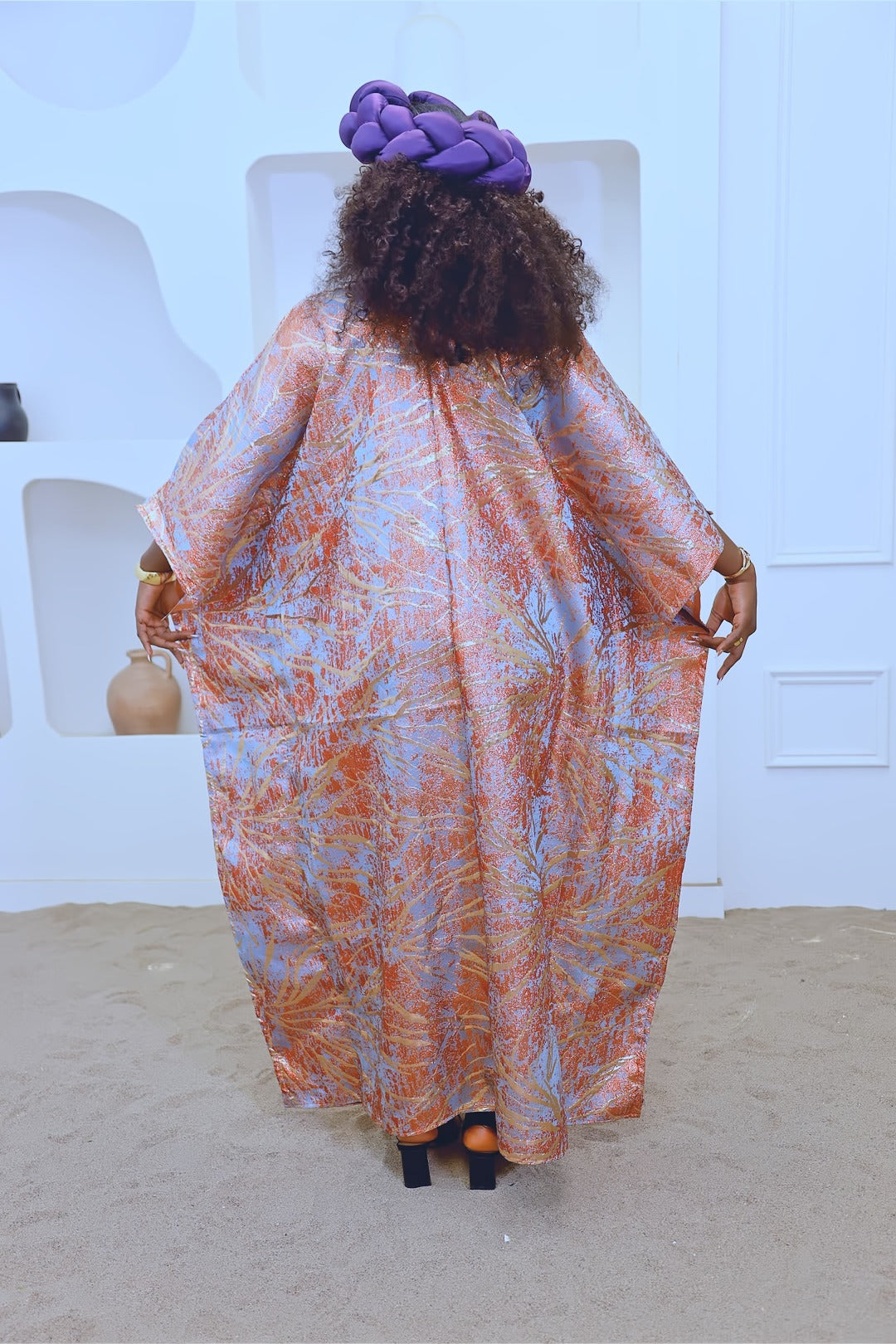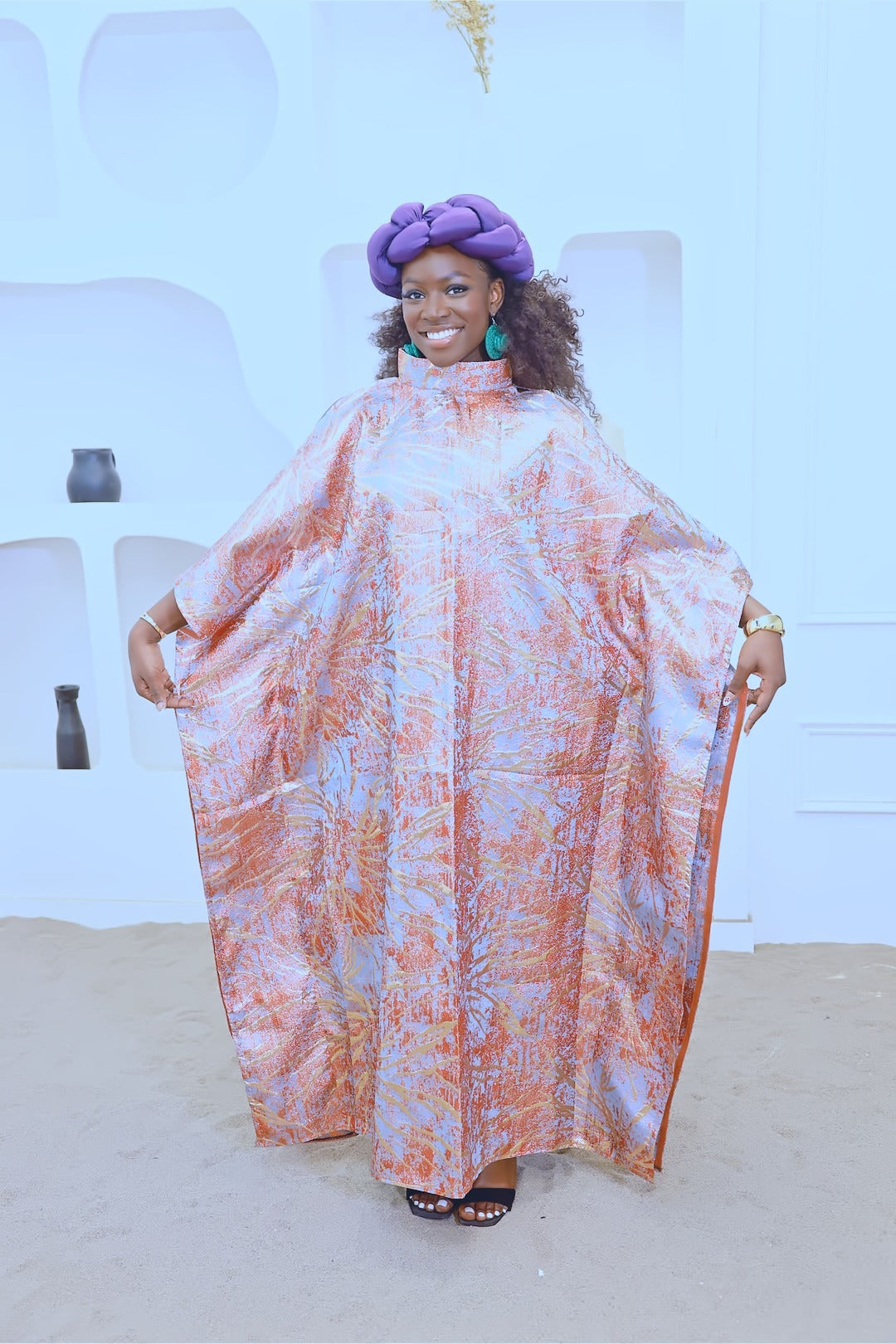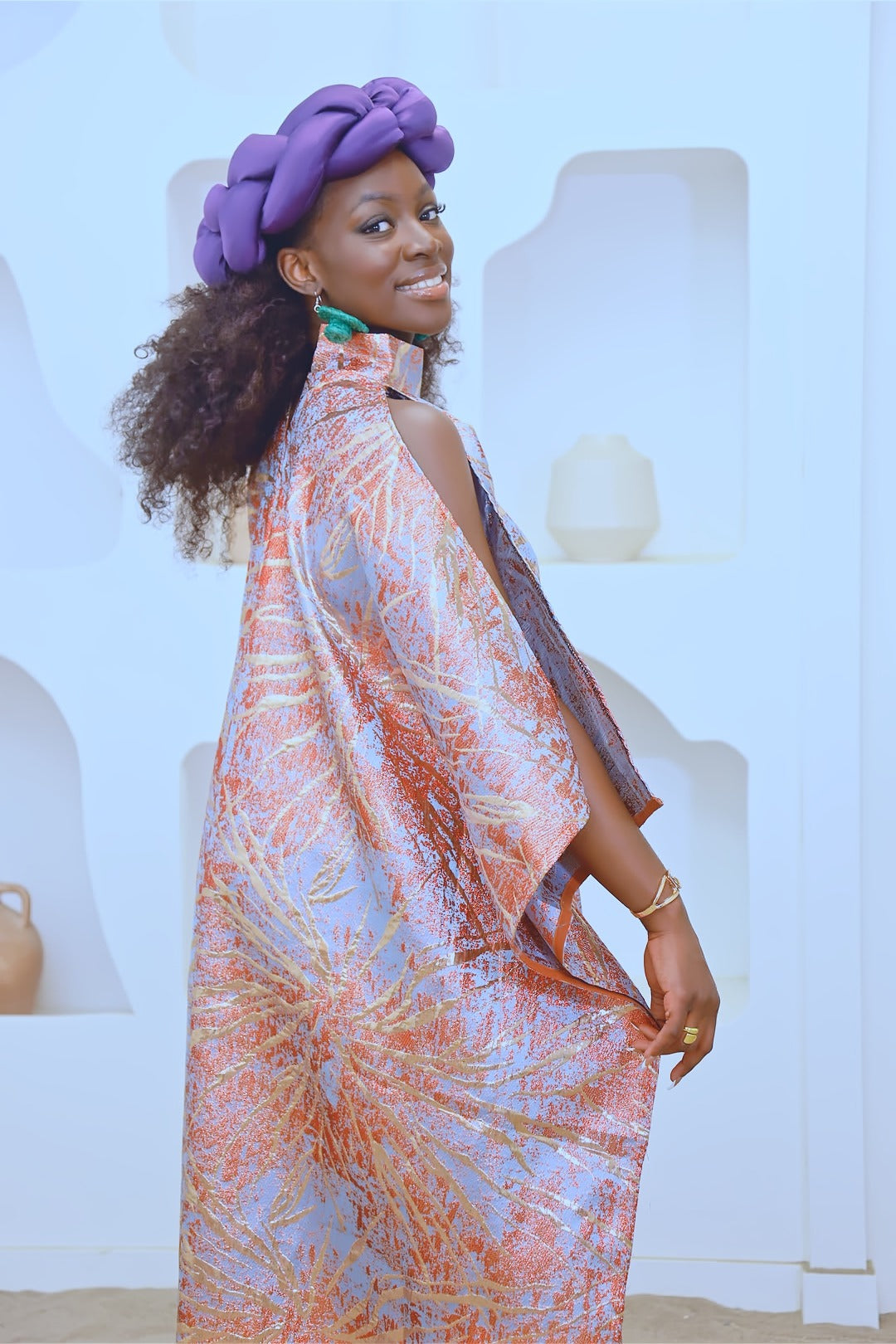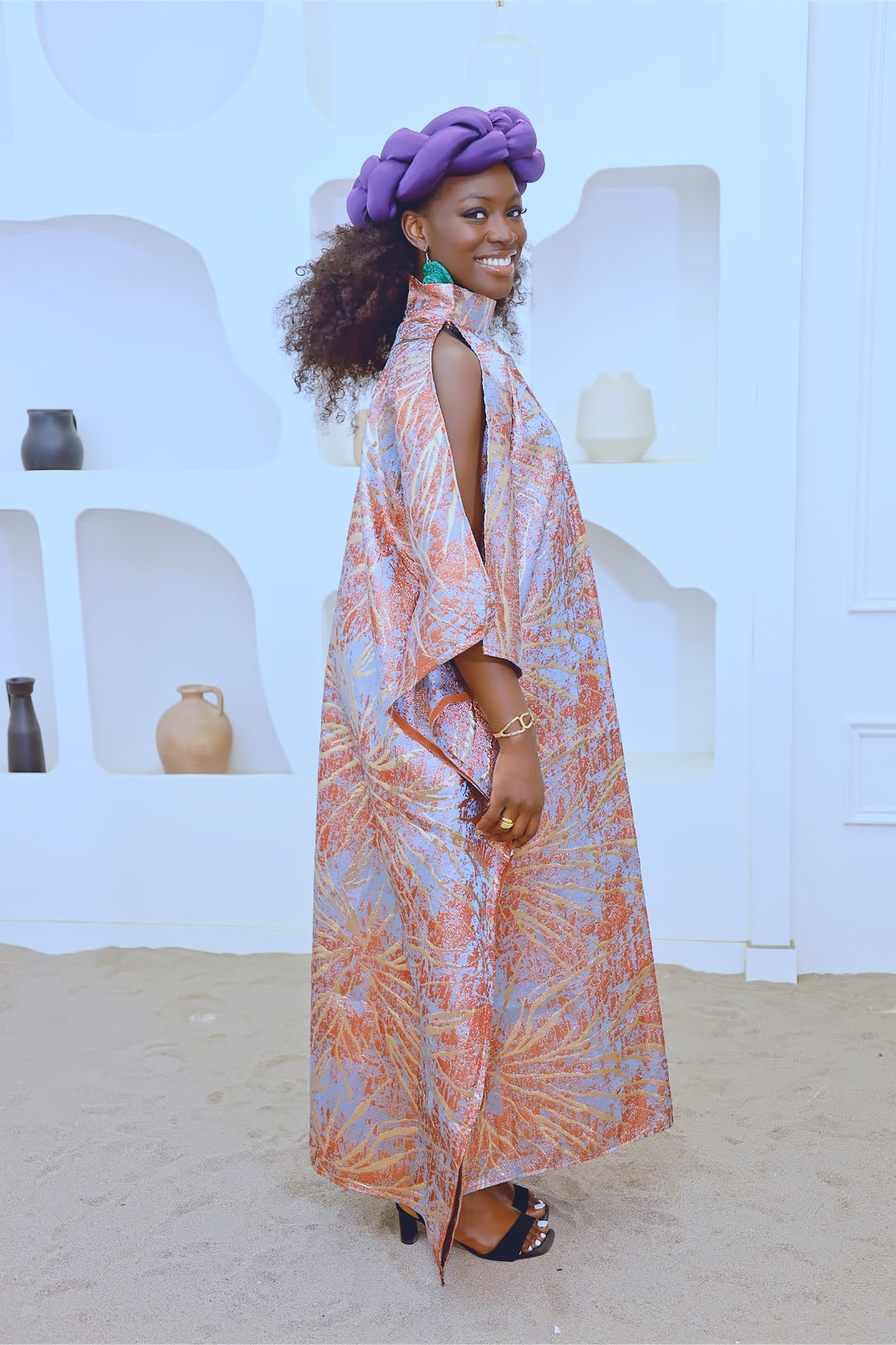 Made of high quality shiny brocade, a turtle neck and slit on the sleeves.